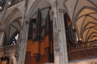 Ich will hier nicht den Reiseleiter für euch geben, schließlich geht es um Rock `n` roll, aber lasst mir doch den Platz für zwei, drei Sätze über etwas besonderes in dieser Stadt (auch in Wolfgangs Sinne), denn man kommt an diesem Bauwerk sowieso nicht vorbei. Tritt man aus dem großen Hauptbahnhof der Stadt, steht man auch gleich davor, vor dem bekanntesten und größten Wahrzeichen jener; Dem Dom zu Köln. Mit einer Höhe von 157 Meter und einem enormen Gesamtumfang, stellt er sicherlich etwas Einzigartiges unter seines gleichen dar. Im Inneren findet man (und nun kommt die Stelle für den musikalischen Liebhaber, auf die es mir ankommt), zwei wunderschöne Orgelinstrumente. Die auffälligste und eindrucksvollste ist die Langhausorgel, welche 20 Meter über dem Boden hängt und selber noch einmal so groß ist. Mit einem Gewicht von 30 Tonnen und ganzen 53 Register, ist sie ein beachtliches Klangerzeuger. Ich möchte fast sagen sie ist phänomenal.